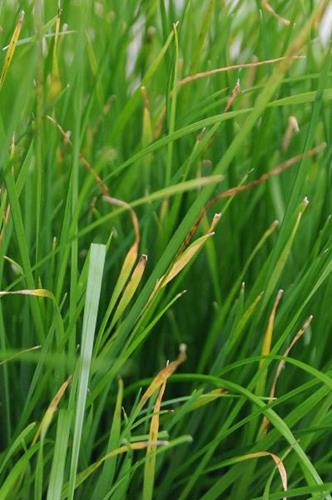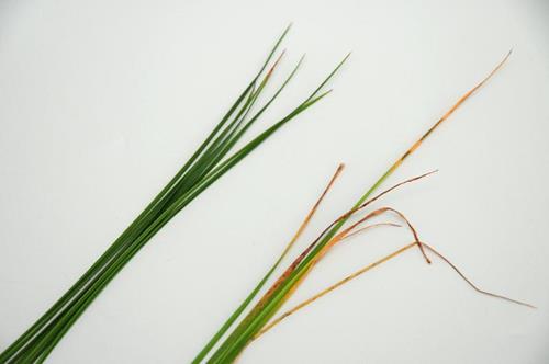 Eldre blader utvikler kloroser og senere nekroser i bladspissen, disse utvikler seg nedover mot bladbasis.