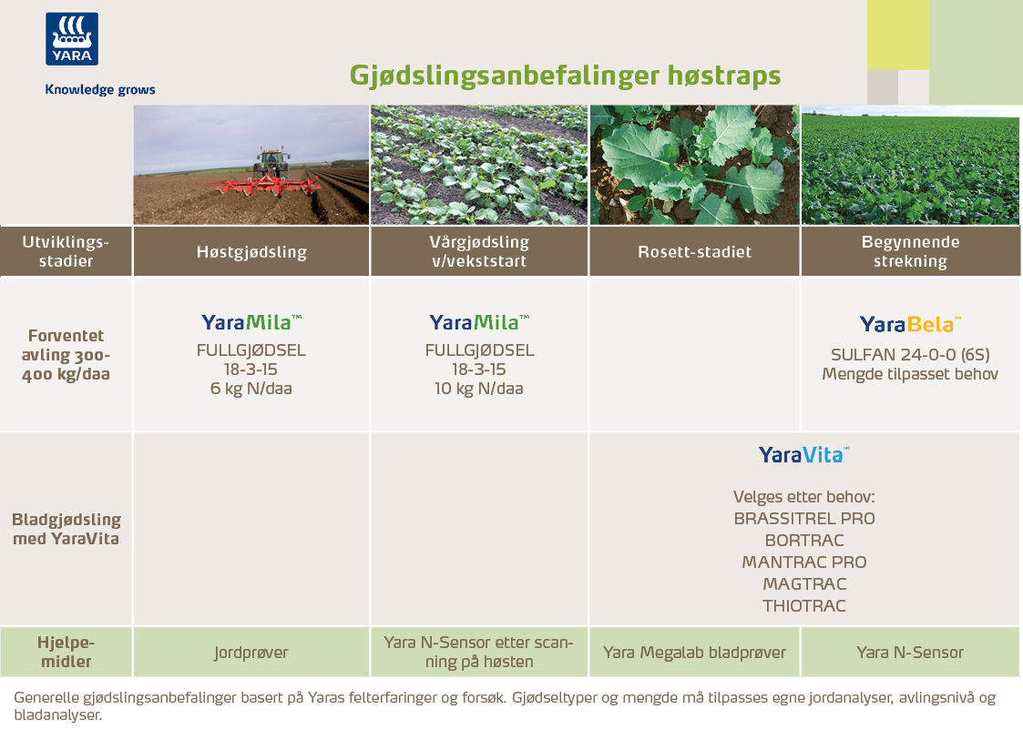 Forventer du et avlingsnivå på 400 kg pr. dekar bør det gis totalt 20 kg N til høstoljevekster. Det resterende nitrogenbehovet bør gis til høstoljevekstene ved begynnende strekking. Høstoljevekster har behov for svovel og til delgjødsling anbefales YaraBela OPTI-NS 27-0-0 (4S) eller YaraBela SULFAN 24-0-0 (6S).