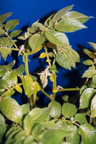 Hele planten blir blek og gulner etter hvert. Unge blader blir fortykket,skrukkete og vrenges oppover (skjeform).