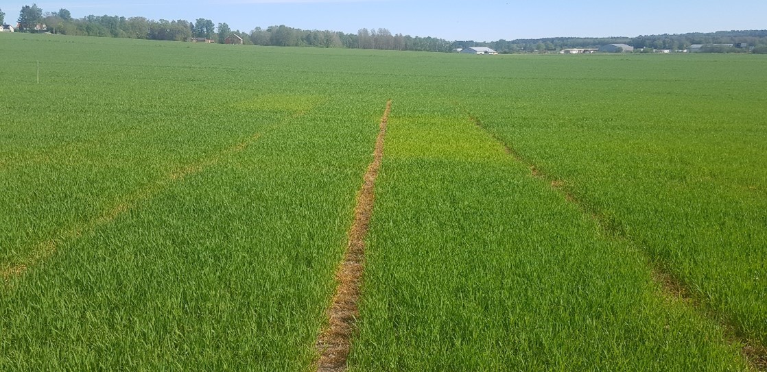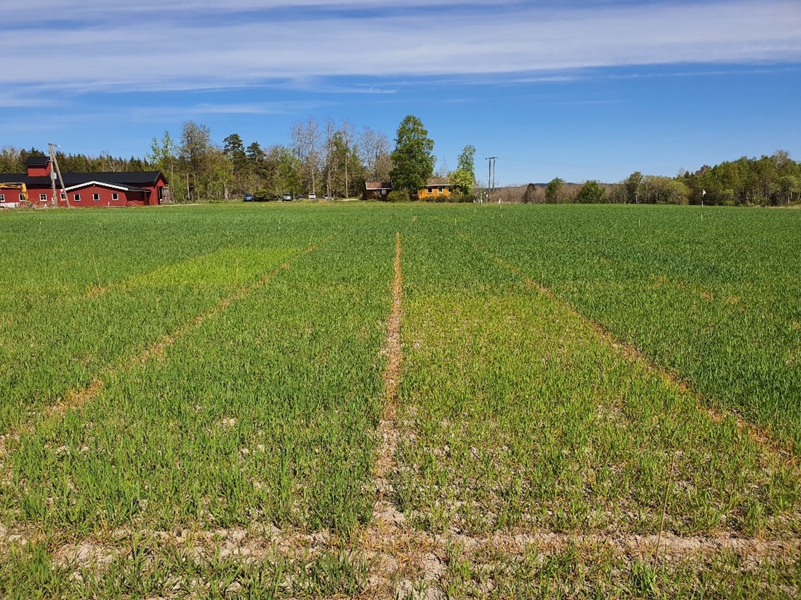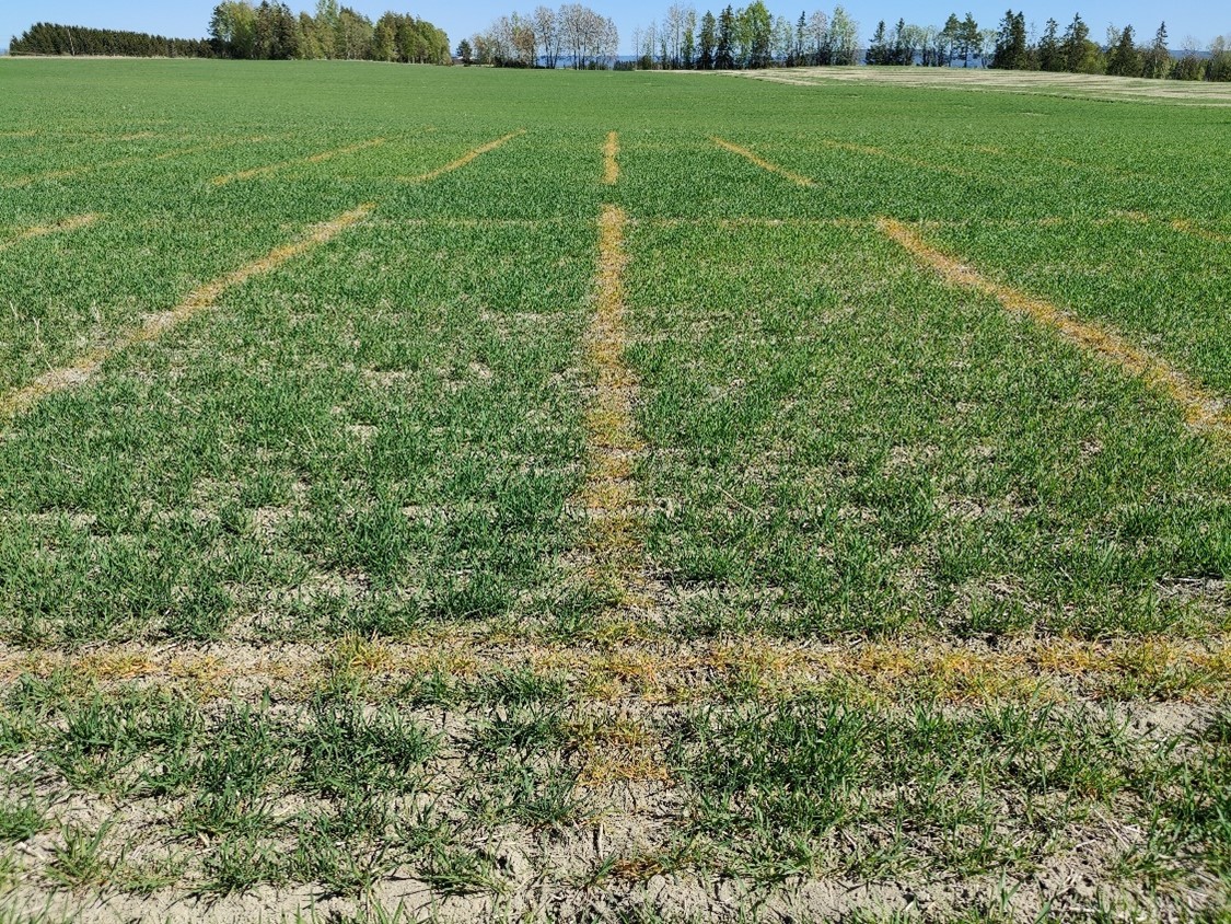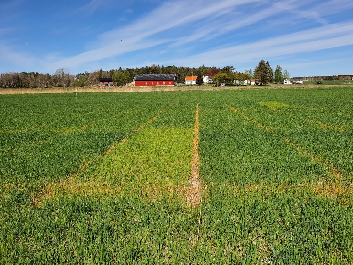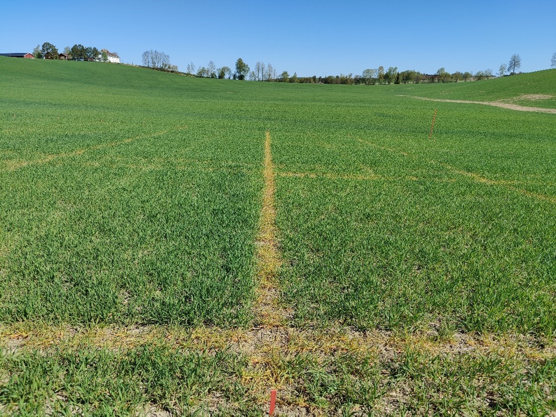 Felt 7. Kuban-åkeren på i Stjørdal har tatt opp 1 kg N/daa siste uka og N-opptaket frem til nå er estimert til i underkant av 3 kg N/daa. På ugjødsla ruter er det ikke målt noen endring i N-opptaket og nullrutene synes godt i åkeren. Plantene har kommet til begynnende strekking og vil bli delgjødslet en av de nærmeste dagene. Foto: Jon Olav Forbord.
