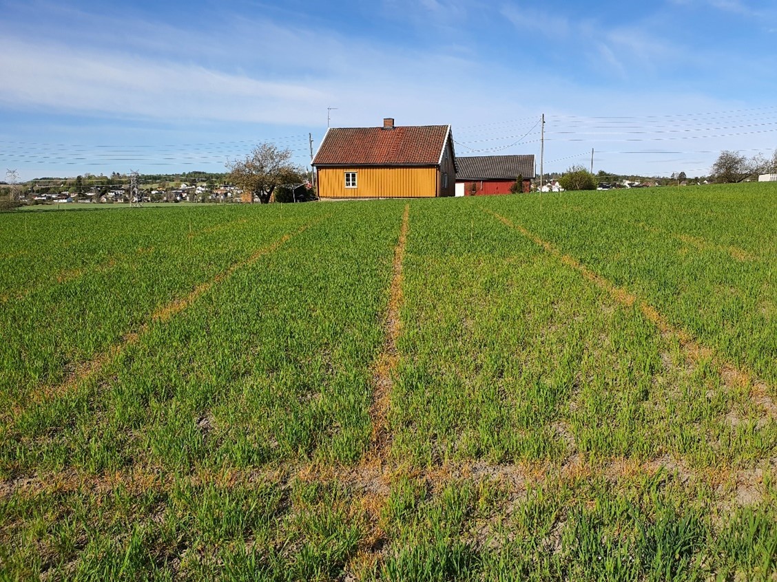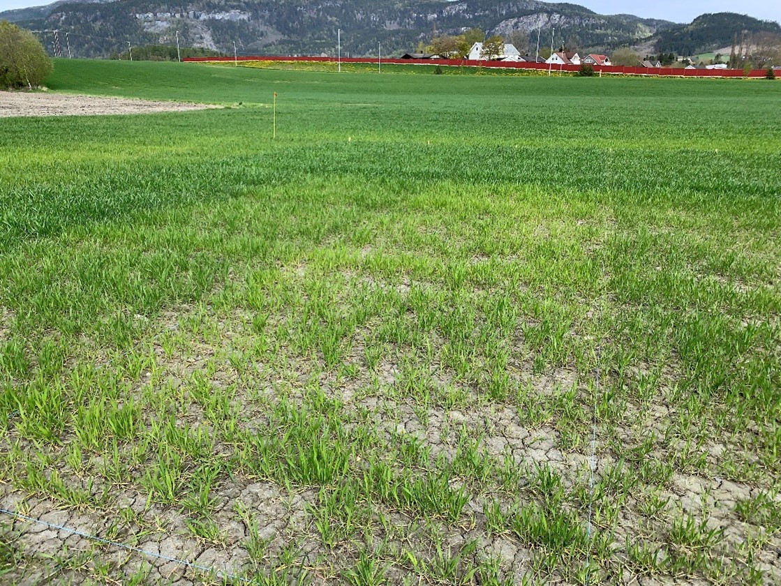 Felt 6. Kuban-åkeren i Tønsberg har tatt opp ca. 1 kg N/daa siste uka. Det estimerte N-opptaket ligger da på 2,9 kg N/daa. På ugjødsla ruter har N-opptaket ikke endret seg siden målingene startet opp. Det kom lite regn forrige uke, og det er fortsatt stort behov for mer nedbør på feltet. Foto: Tore Røisehagen Daarstad.