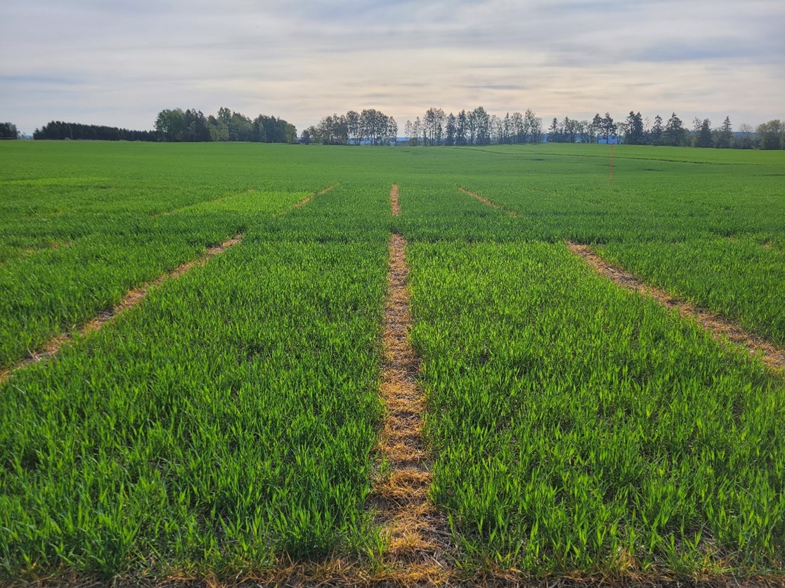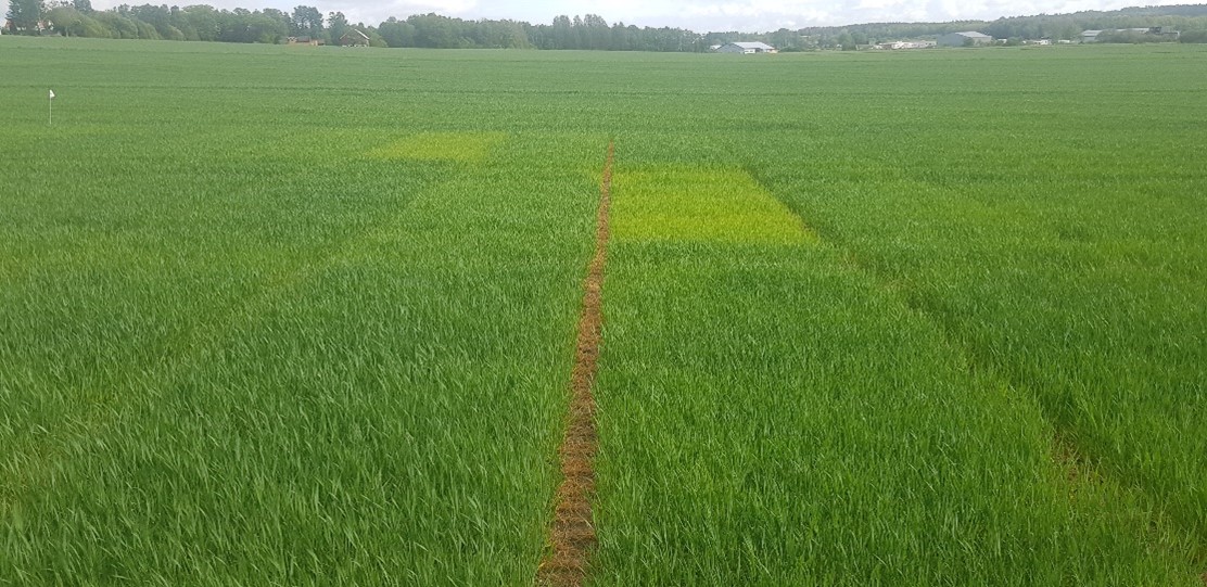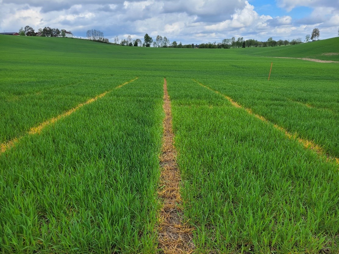 Felt 4. Kuban-åkeren på Vormsund har begynt strekkingsperioden og har kommet til vekststadium 32. Det er estimert et opptak på 0,5 kg N/daa siste uka på gjødsla ruter og ingen endring på ugjødsla ruter. Det er fortsatt små forskjeller i N-opptaket mellom ugjødsla og gjødsla ruter. Det er behov for mer regn videre i strekkingsperioden for den videre utviklingen av plantene. Foto: Morten Botilsrud.