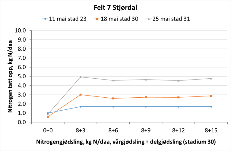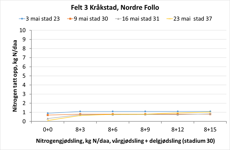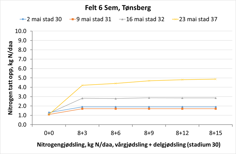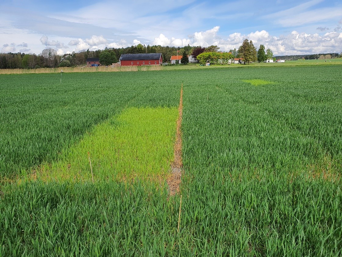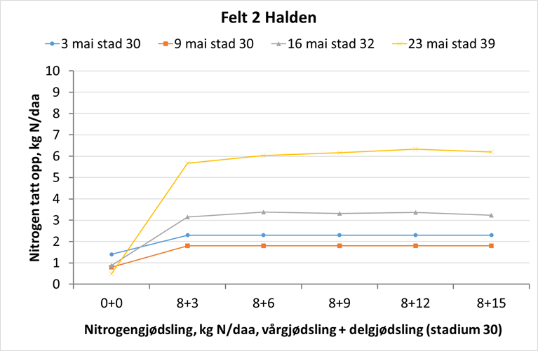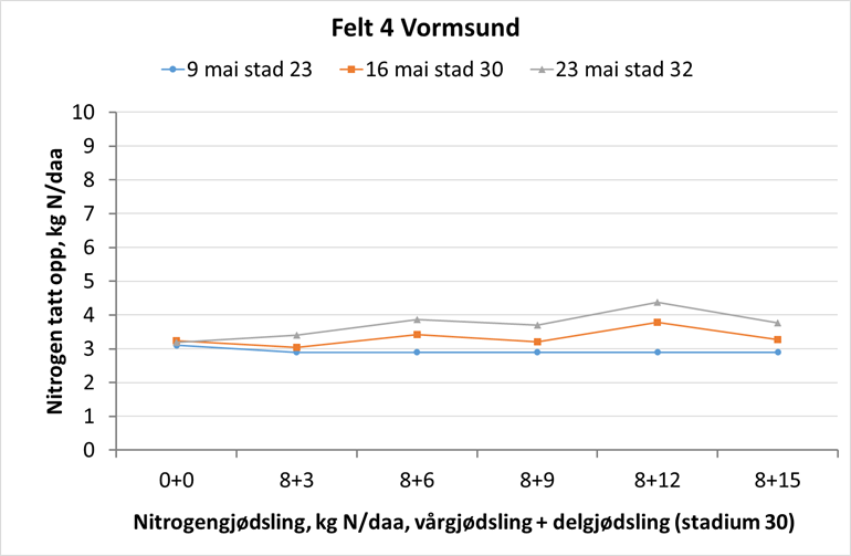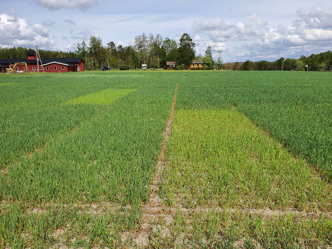 Felt 5. Julius-åkeren på Vormsund har på ny tatt opp ca. 0,5 kg N/daa siste uka. Plantene er i begynnelsen av strekkingsperioden og har tatt opp totalt 3,9 kg N/daa i overjordisk biomasse. Ugjødsla ruter har ikke endret seg siste uka, og opptaket ligger på 2,2 kg N/daa. Åkeren ser fin ut, og er ikke like preget av vannmangel som det andre feltet på Vormsund. Hvis området tildeles regn den kommende tida, har dette feltet et bra utgangspunkt for god vekst fremover. Foto: Morten Botilsrud.