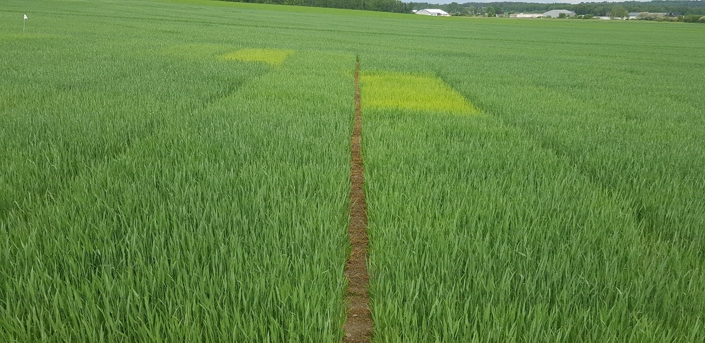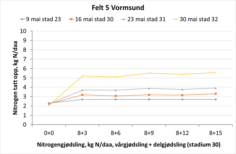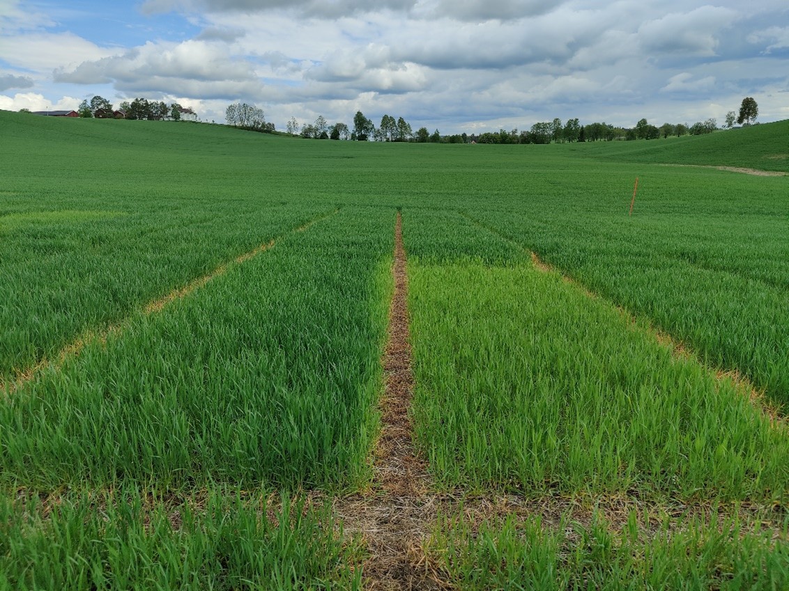 Felt 4. Kuban-åkeren på Vormsund har hatt et høyt N-opptak siste uka. I overjordisk biomasse er det tatt opp 2-2,5 kg N/daa i opptak. Plantene er midt i strekkingsperioden, og utnytter både gjødsel og regnet godt. Selv om åkeren er noe preget av tørken, er potensialet fortsatt bra på denne åkeren. Det kjølige, regnfulle været som er noen dager nå, etterfulgt av mer sol og varme vil være svært gunstig for høsthveteplantene. Det er fortsatt litt tid til siste delgjødsling på dette feltet. Foto: Michael Aamold.