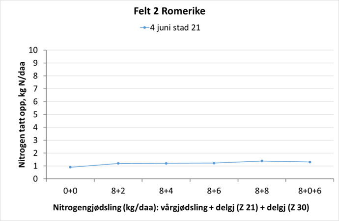 Forsøkene ble gjødslet med 8 kg N/daa på våren. Ved buskingsstadiet gjødsles det med enten 2, 4, 6 eller 8 kg N/daa. Noen av feltene kommet til busking og noen til starten av strekkingsperioden, z 30. Det vil bli gjennomført målinger frem til skyting.