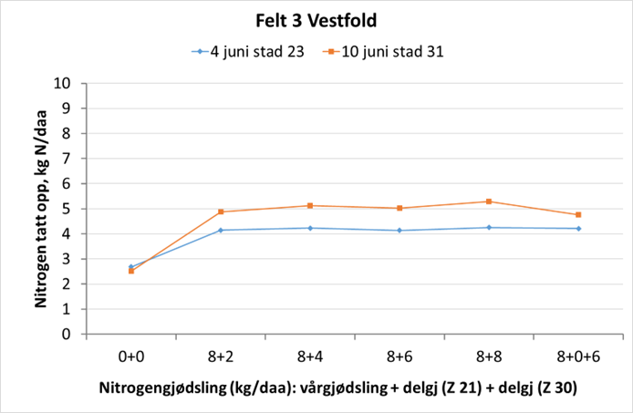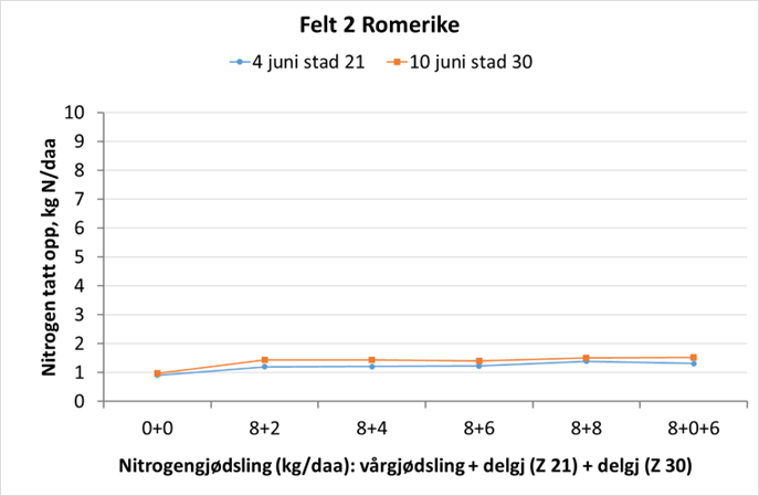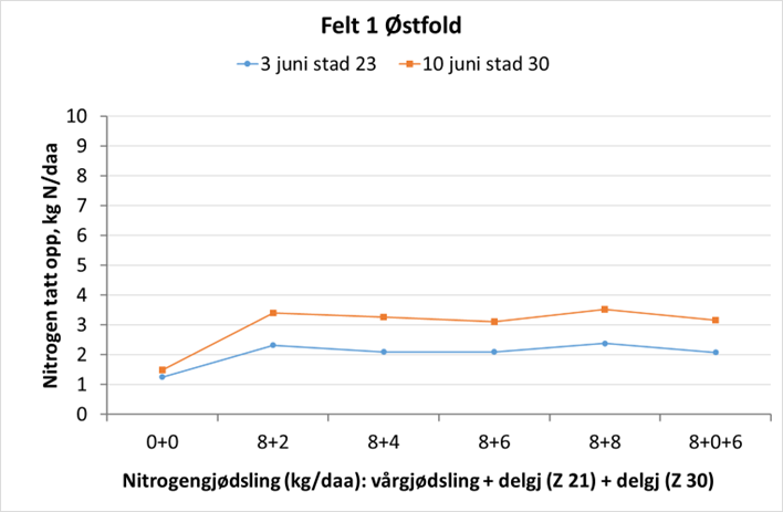 Foreløpig er det små forskjeller mellom de ulike gjødslingsleddene i nitrogenopptak. Det kjøligere været som råder om dagen, har senket utviklingshastigheten på kornet, og gjort at det får bedre tid til vekst og utvikling av aks, småaks og korn.