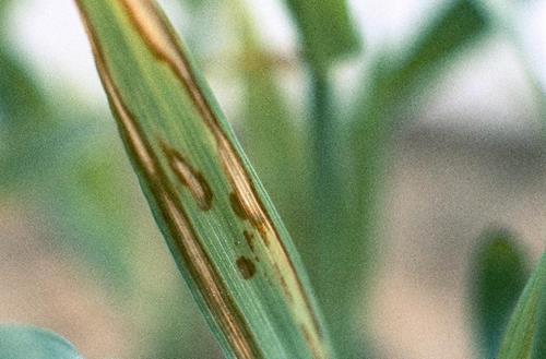 På dette bildet viser et fullt utvokst blad en irregulær lysbrun lesjon, som er omkranset av mørkebrun randsone.