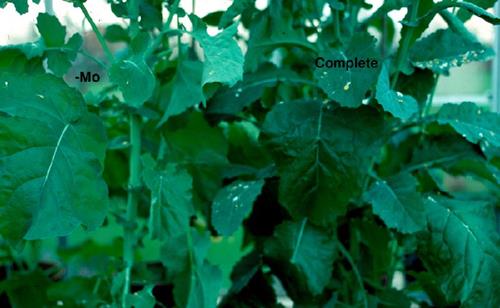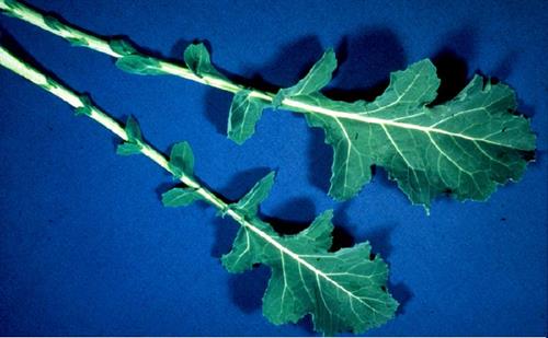 Bladplata på bladene får redusert størrelse; i alvorlige tilfeller ser man nesten bare midtnerven på bladet ("whiptail"). Perforering i bladverket mellom bladnervene kommer til syne.
