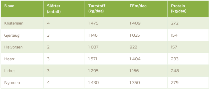 Vinnere ble Ingrid Holm og Tore Kristensen fra Sparbu i Steinkjer. De tok fire slåtter med jevn og svært god kvalitet og fikk til sammen 1475 kg tørrstoff som ga 1409 FEm og 272 kg protein pr. dekar. De hadde en Nutrifiber-blanding sådd året før, som besto av 75 prosent strandsvingel, 15 prosent flerårig raigras og ti prosent hvitkløver. I tillegg ble det isådd 1 kg pr. dekar med flerårig raigras våren 2023.